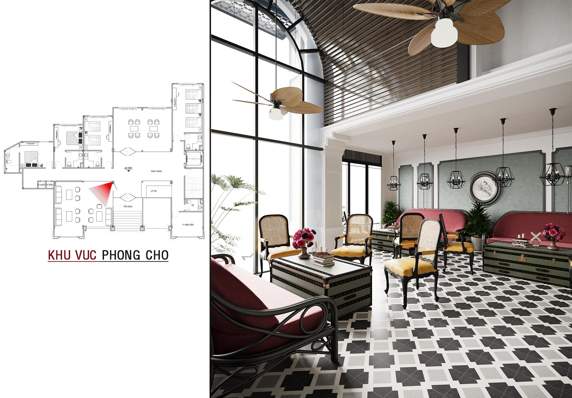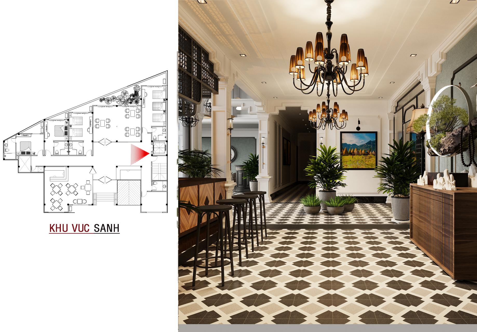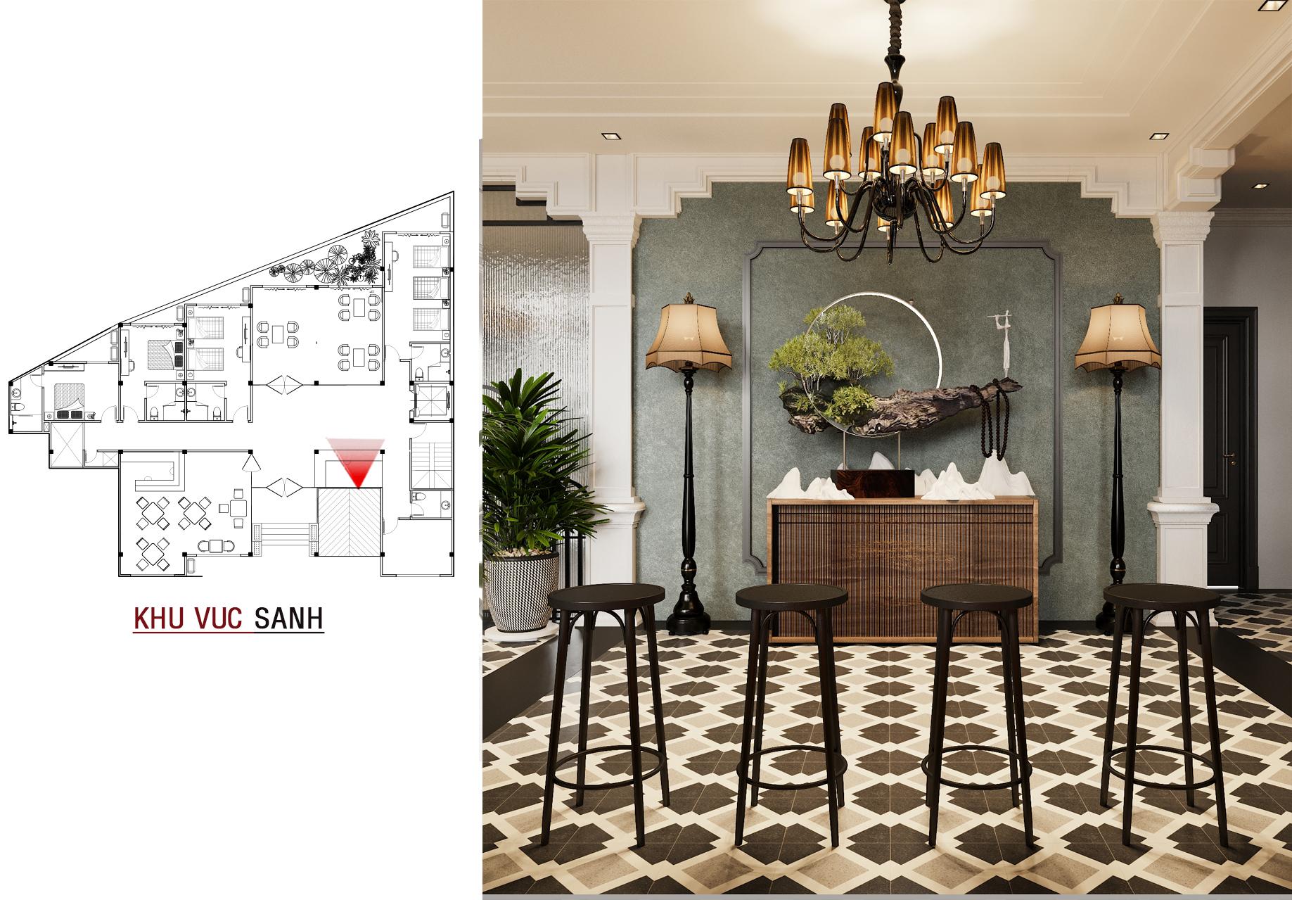 Bước vào bên trong, không gian sảnh chính gây ấn tượng mạnh mẽ với sàn gạch bông họa tiết cổ điển, quầy bar ốp gỗ ấm cúng và những chi tiết trang trí tinh tế như đèn lồng cách điệu. Mọi thứ hòa quyện tạo nên một không gian đón tiếp sang trọng, lịch lãm và đậm chất nghệ thuật.