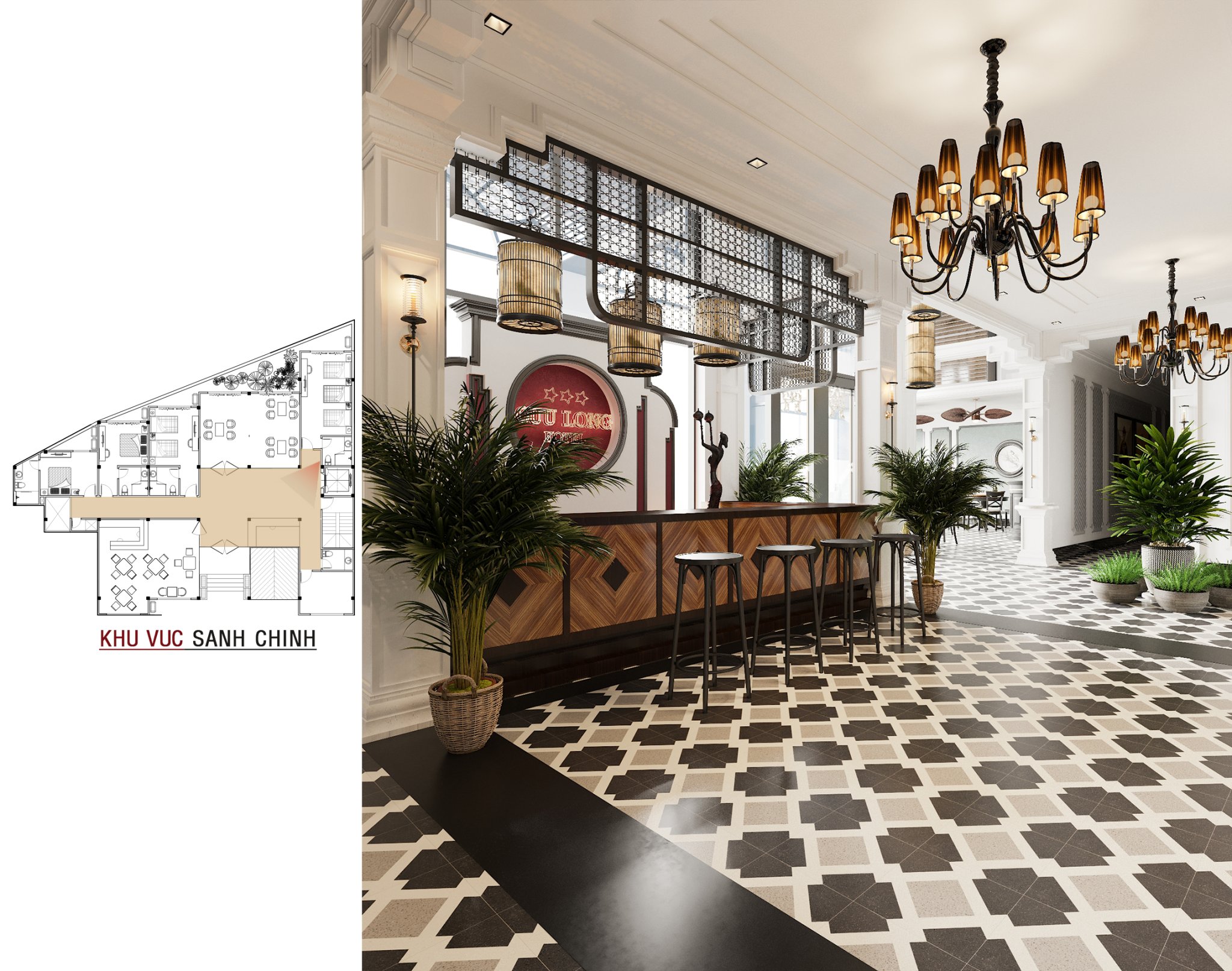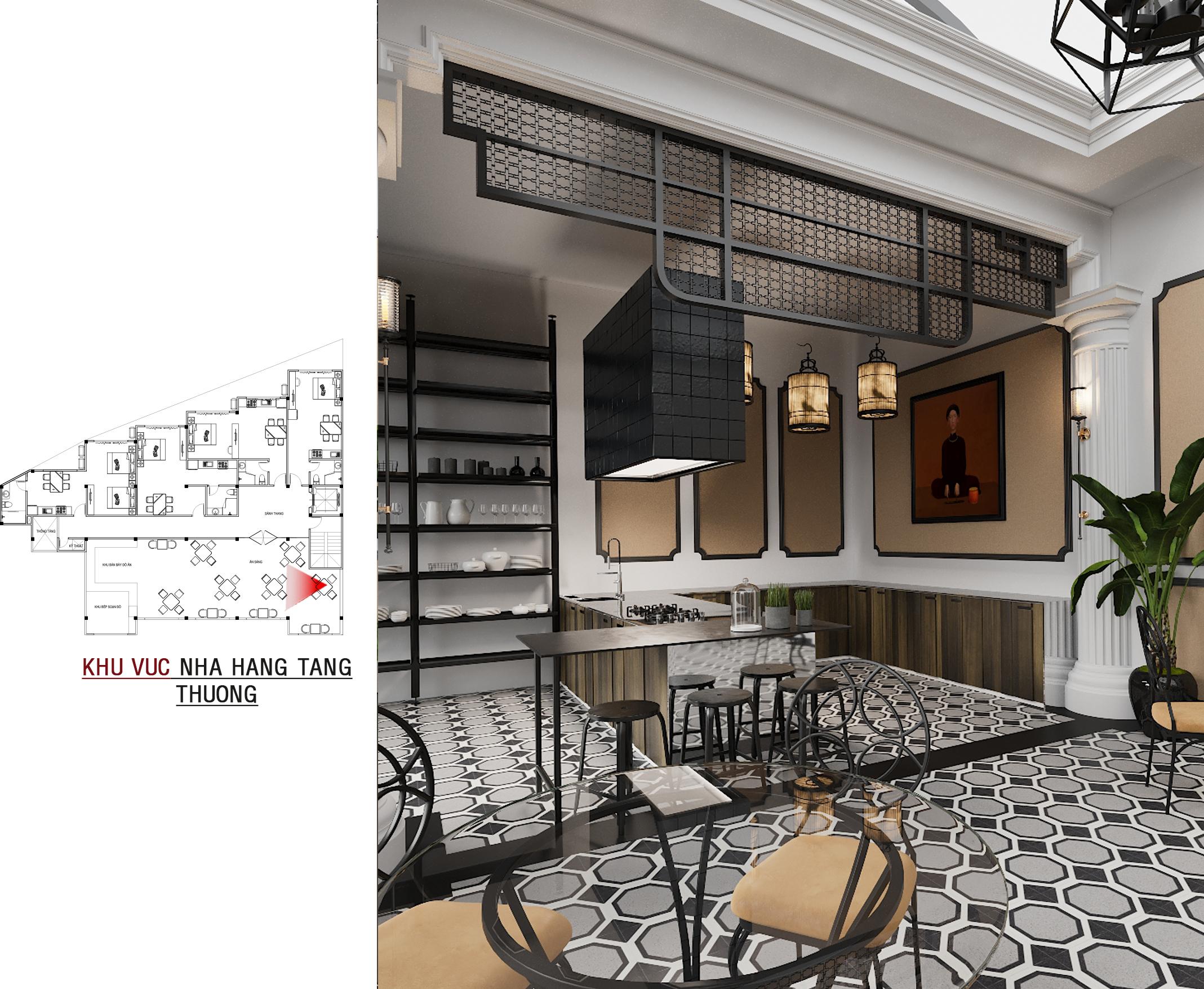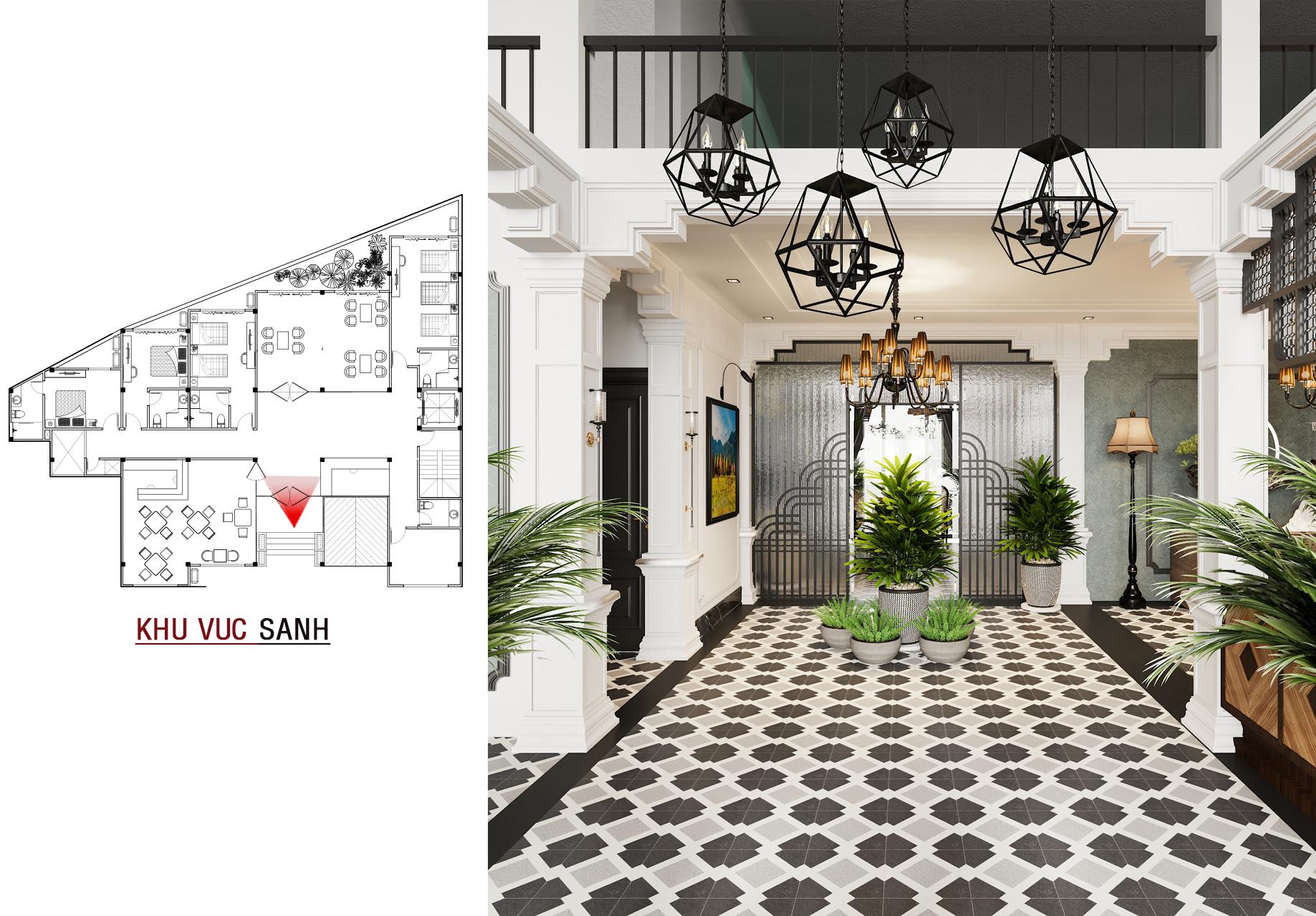 Bước vào bên trong, không gian sảnh chính gây ấn tượng mạnh mẽ với sàn gạch bông họa tiết cổ điển, quầy bar ốp gỗ ấm cúng và những chi tiết trang trí tinh tế như đèn lồng cách điệu. Mọi thứ hòa quyện tạo nên một không gian đón tiếp sang trọng, lịch lãm và đậm chất nghệ thuật.