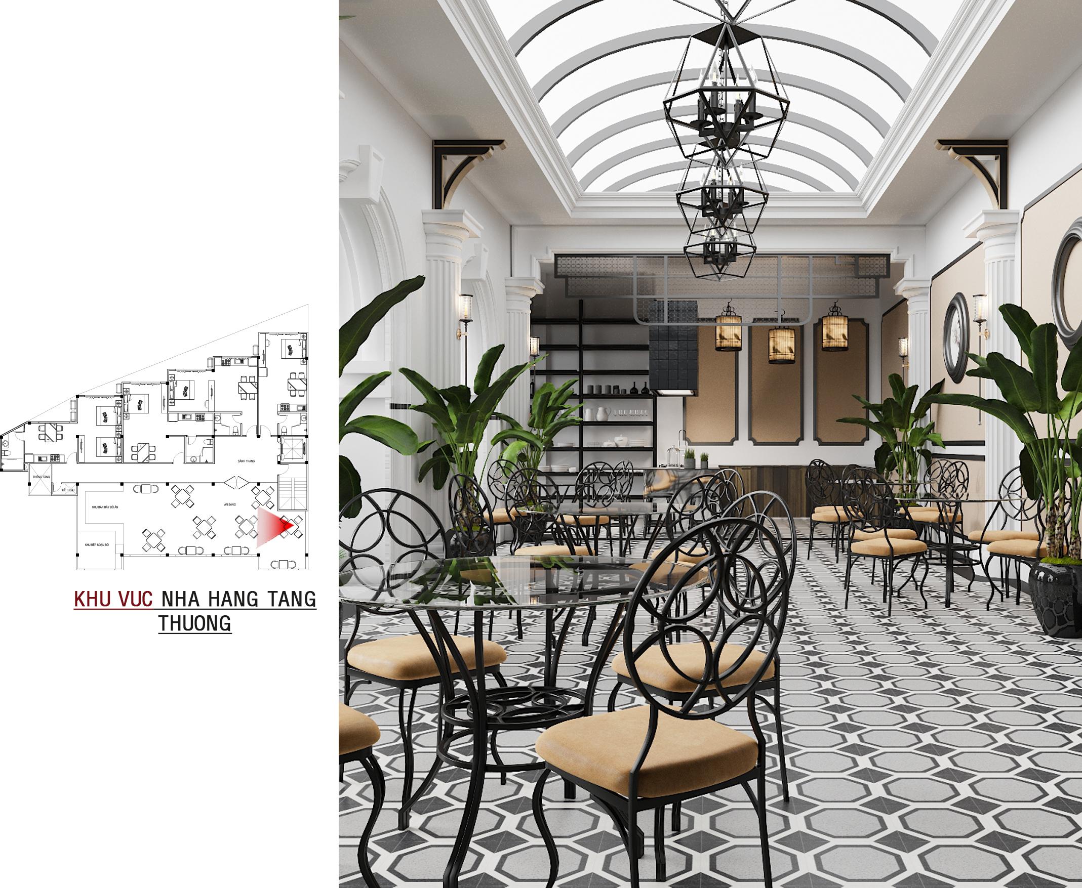 Tầng thượng là không gian nhà hàng thoáng đãng dưới mái vòm kính, nơi thực khách có thể thưởng thức ẩm thực trong một khung cảnh lãng mạn. Nội thất với bàn kính và ghế sắt uốn nghệ thuật gợi nhớ đến những quán cà phê ngoài trời của châu Âu xưa.