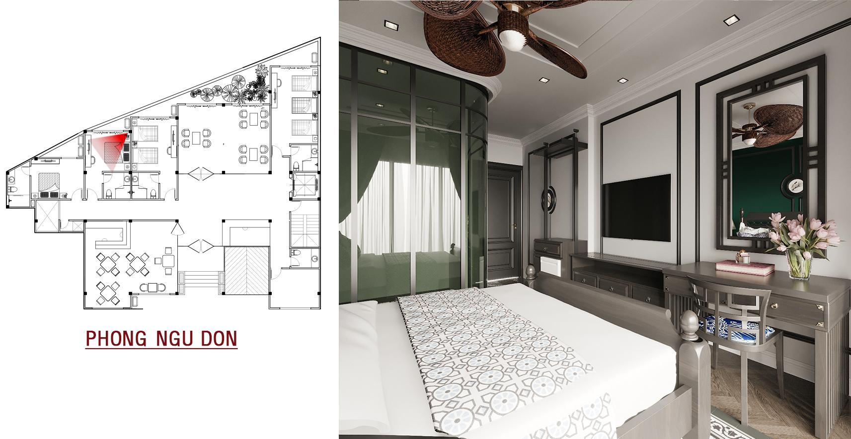 Phòng ngủ đơn được thiết kế thông minh, tối ưu công năng với tông màu trầm ấm, mang lại cảm giác ấm cúng và riêng tư cho du khách.