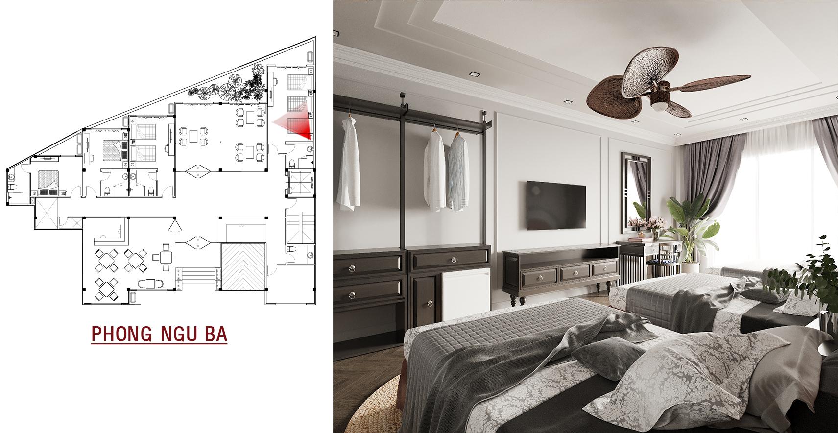 Rộng rãi và tiện nghi, phòng ngủ ba vẫn giữ trọn vẹn tinh thần thiết kế chung, là lựa chọn lý tưởng cho các nhóm bạn hoặc gia đình nhỏ.