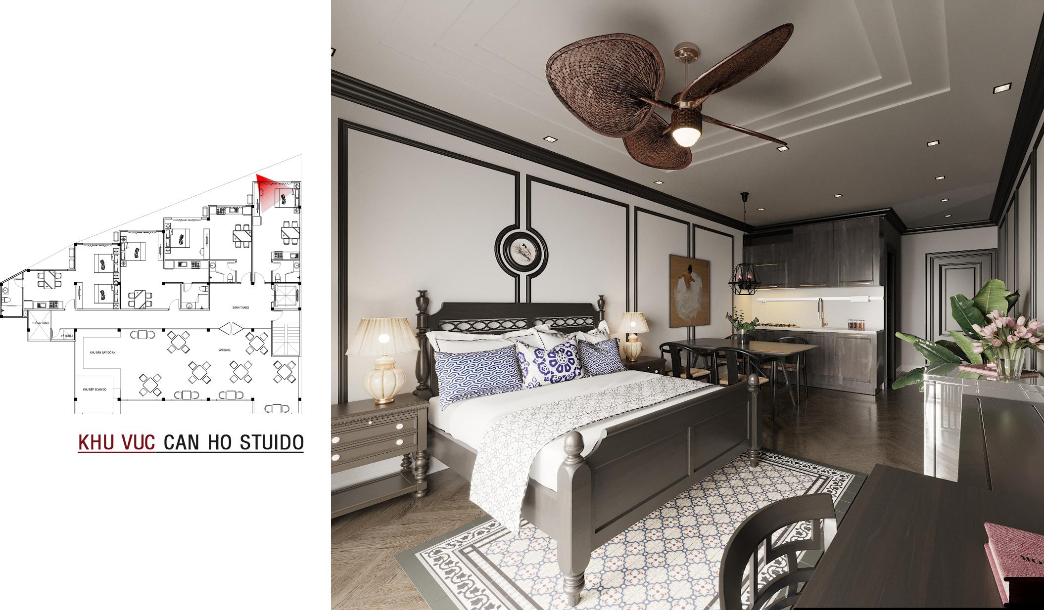 Căn hộ studio là một không gian sống hoàn chỉnh với khu vực giường ngủ, bàn ăn và bếp nhỏ. Thiết kế vẫn mang đậm dấu ấn Đông Dương, kết hợp giữa sàn gỗ xương cá và gạch bông, mang lại trải nghiệm tiện nghi như ở nhà.