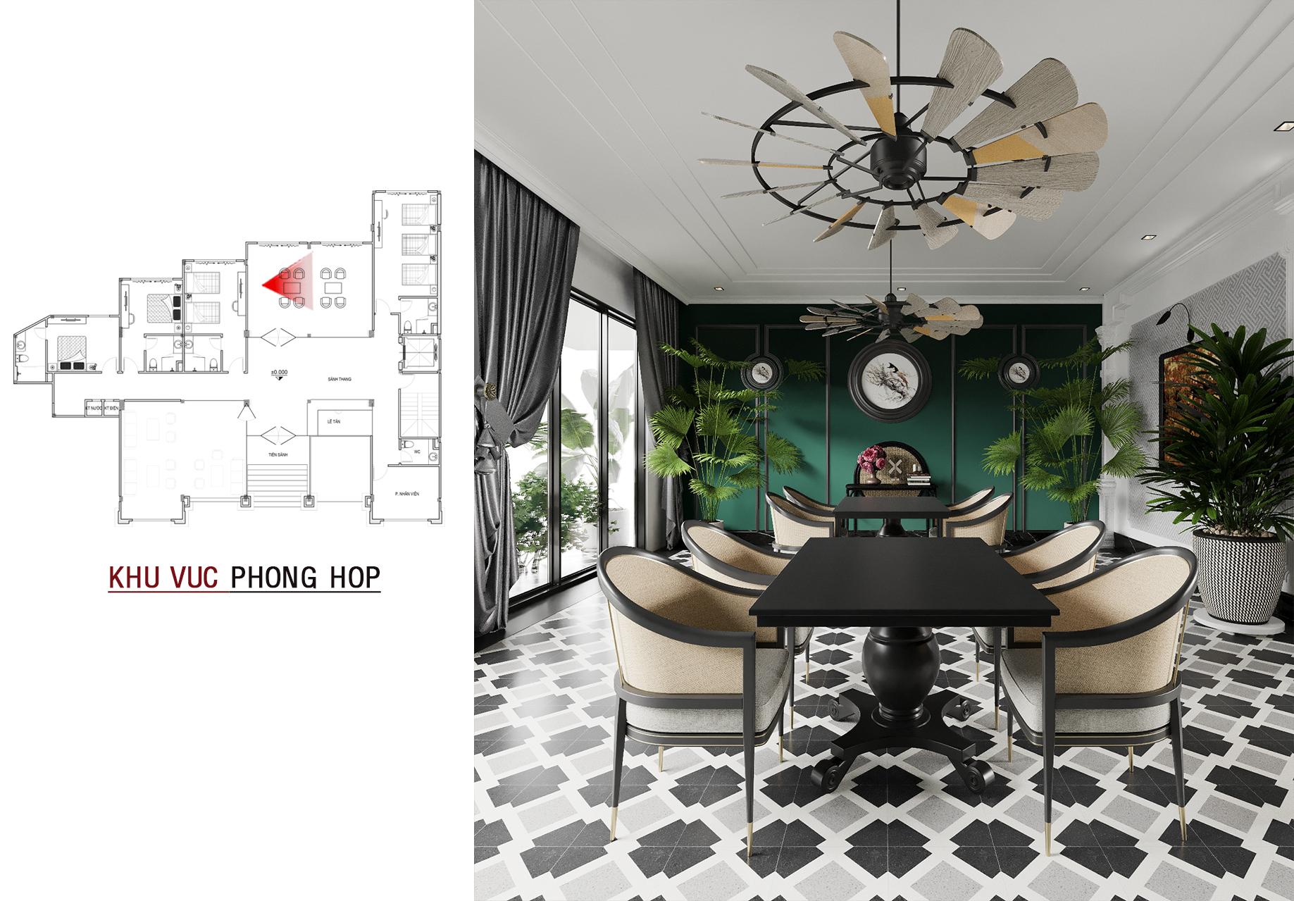 Phòng họp được thiết kế riêng tư và trang trọng với tông màu xanh rêu đậm làm chủ đạo, kết hợp cùng nội thất gỗ đen và ghế bọc nệm màu kem, tạo nên một không gian làm việc chuyên nghiệp và đẳng cấp.
