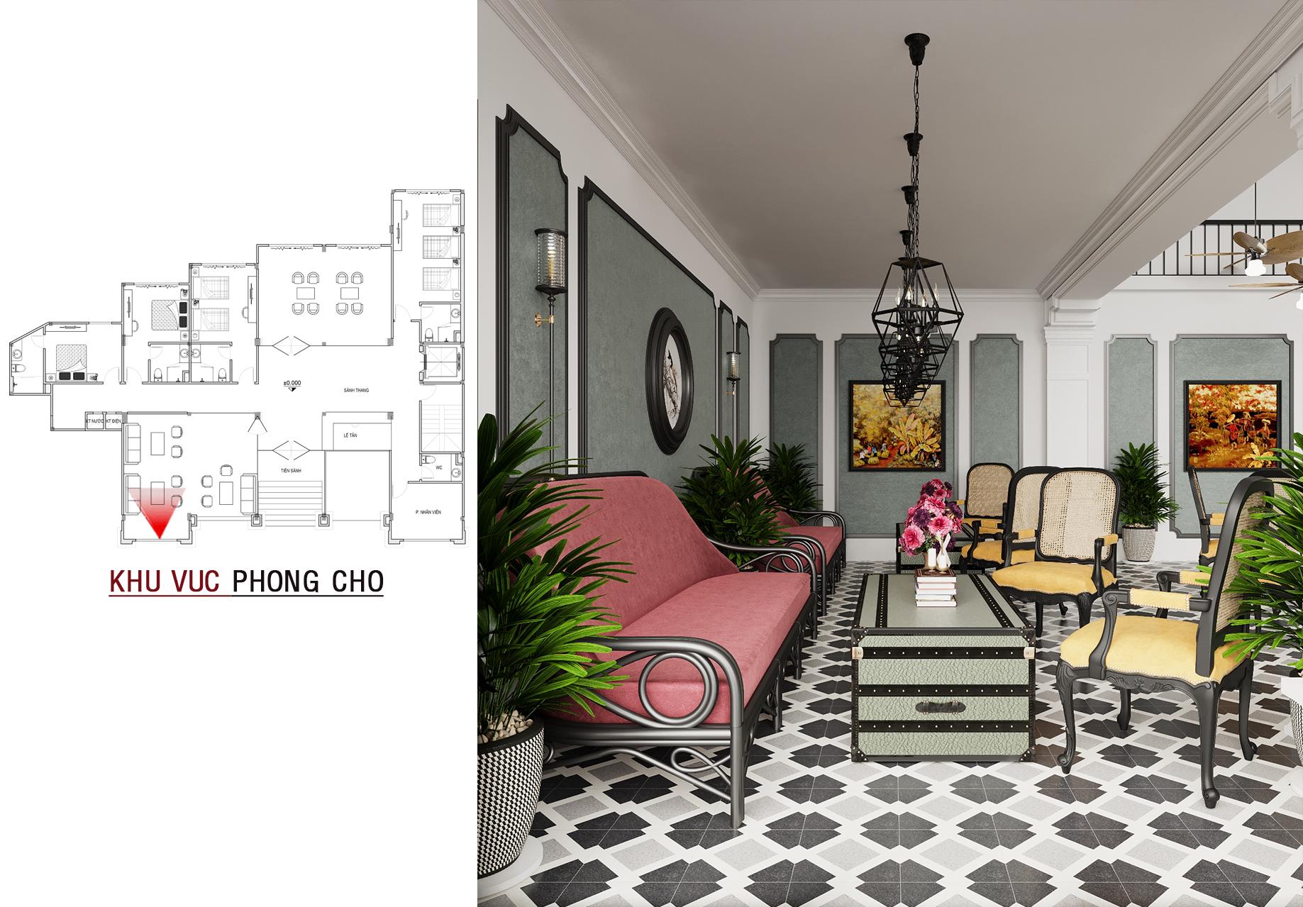 Phòng chờ được bố trí cạnh cửa sổ lớn hình vòm, đón trọn ánh sáng tự nhiên. Nội thất là sự kết hợp giữa nét hoài cổ của ghế mây, sofa bọc nỉ và sự mạnh mẽ của bàn trà kiểu rương hòm, mang lại một không gian thư giãn đầy phong cách.