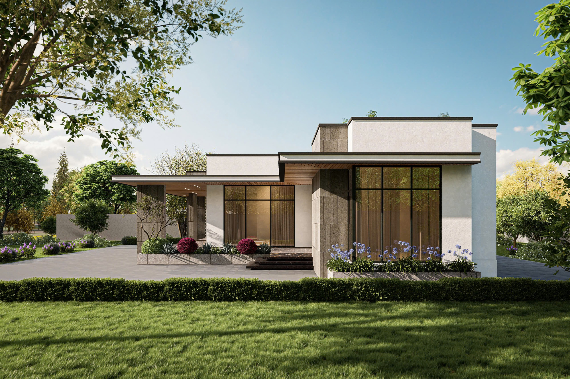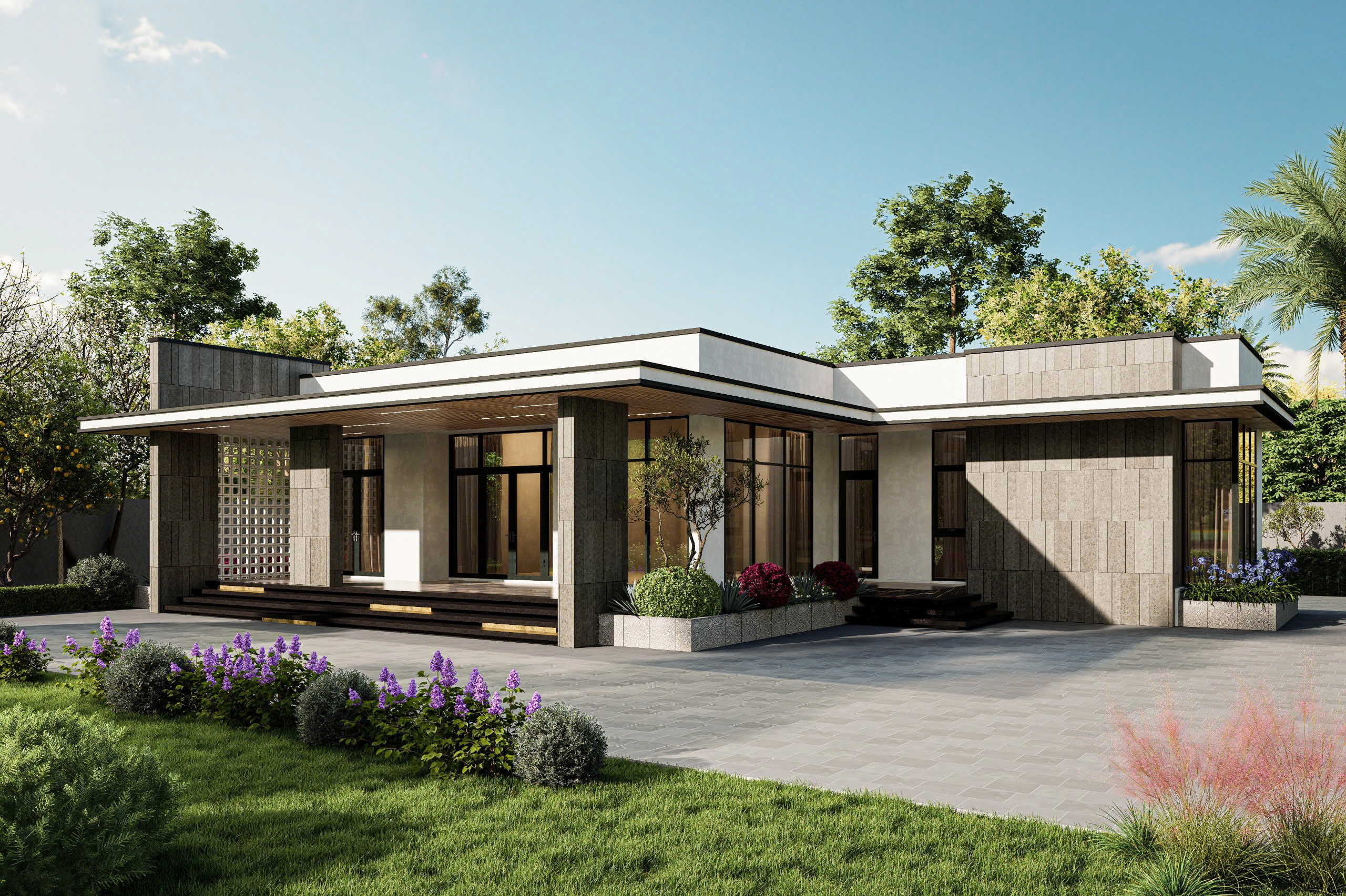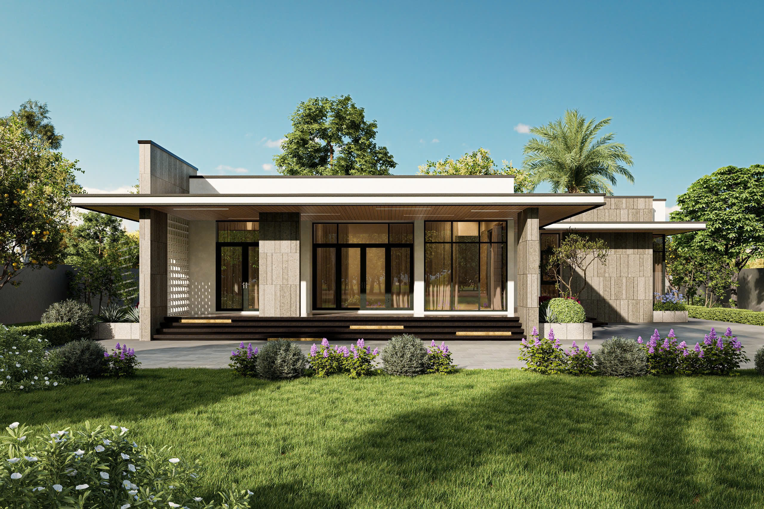 Ngôi biệt thự vườn một tầng mang phong cách kiến trúc hiện đại, tinh tế và hoàn toàn hòa mình vào thiên nhiên. Thiết kế tập trung vào các đường nét tối giản, mái bằng vươn rộng che chở và hệ cửa kính lớn, xóa nhòa ranh giới giữa không gian trong và ngoài, mang đến cảm giác nghỉ dưỡng thư thái ngay tại nhà.