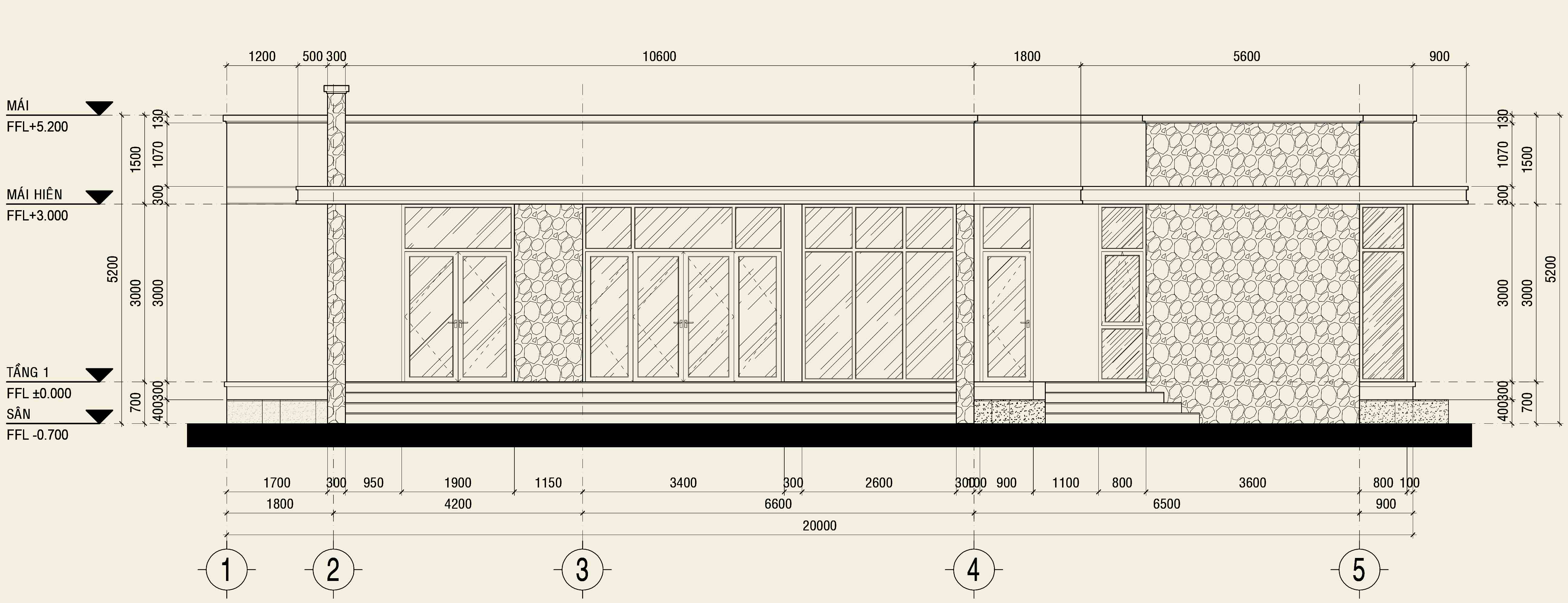 Bản vẽ mặt đứng thể hiện rõ cấu trúc kiến trúc vững chãi nhưng thanh thoát. Sự kết hợp giữa các vật liệu như đá ốp, gỗ và kính tạo nên một tổng thể hài hòa, sang trọng và bền vững cùng thời gian.