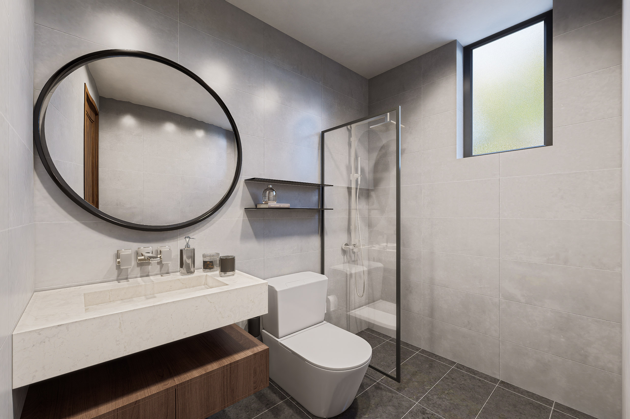 Phòng tắm được thiết kế tối giản, sạch sẽ với các vật liệu hiện đại như đá marble và kính. Việc bố trí công năng hợp lý giúp tối ưu không gian và mang lại trải nghiệm thư giãn thoải mái cho người sử dụng.