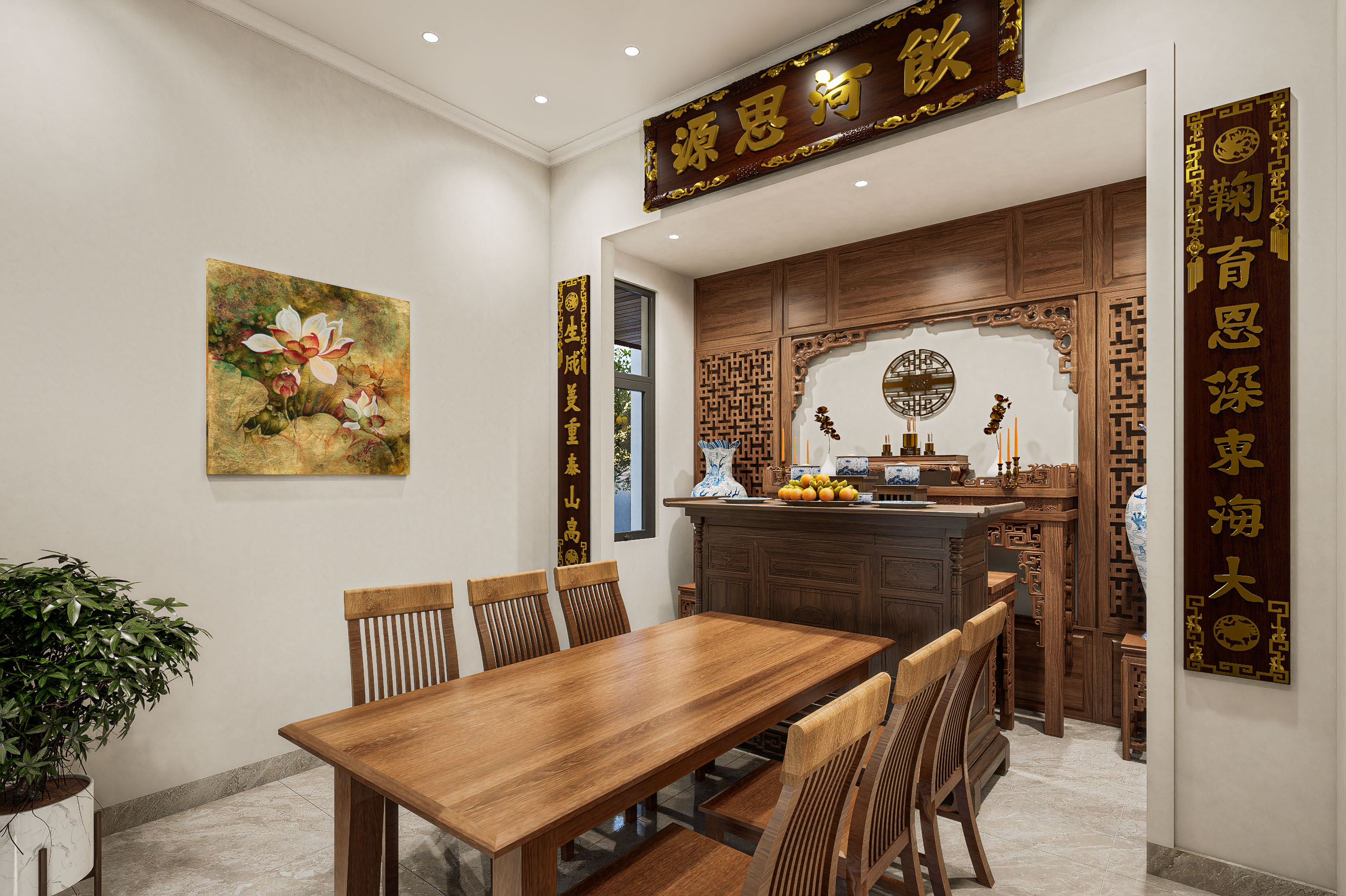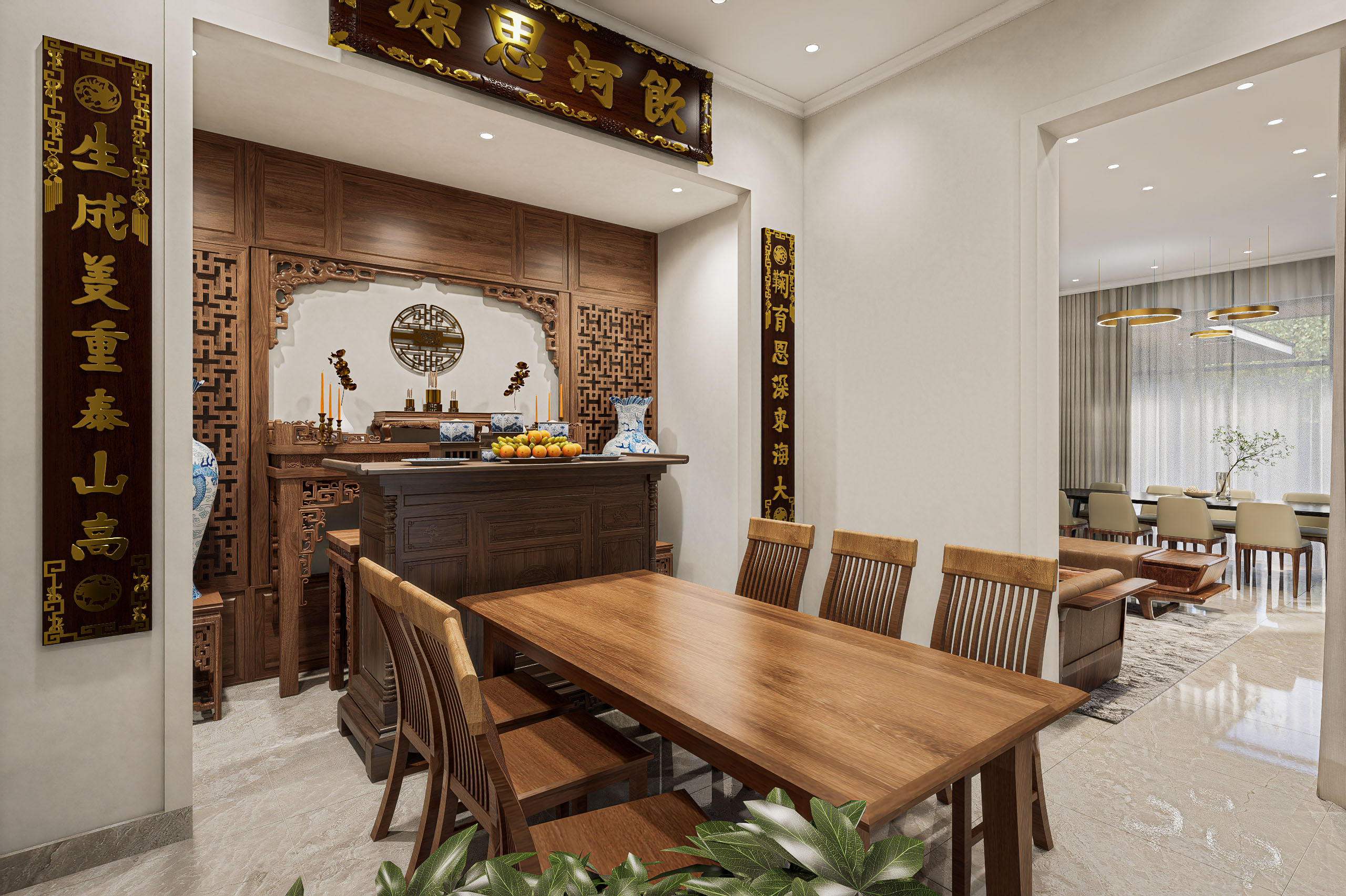 Phòng thờ được đặt ở một vị trí trang nghiêm, tách biệt với không gian sinh hoạt ồn ào. Thiết kế sử dụng vật liệu gỗ tự nhiên với các chi tiết chạm khắc tinh xảo, thể hiện sự tôn kính và giữ gìn nét văn hóa truyền thống của gia đình.
