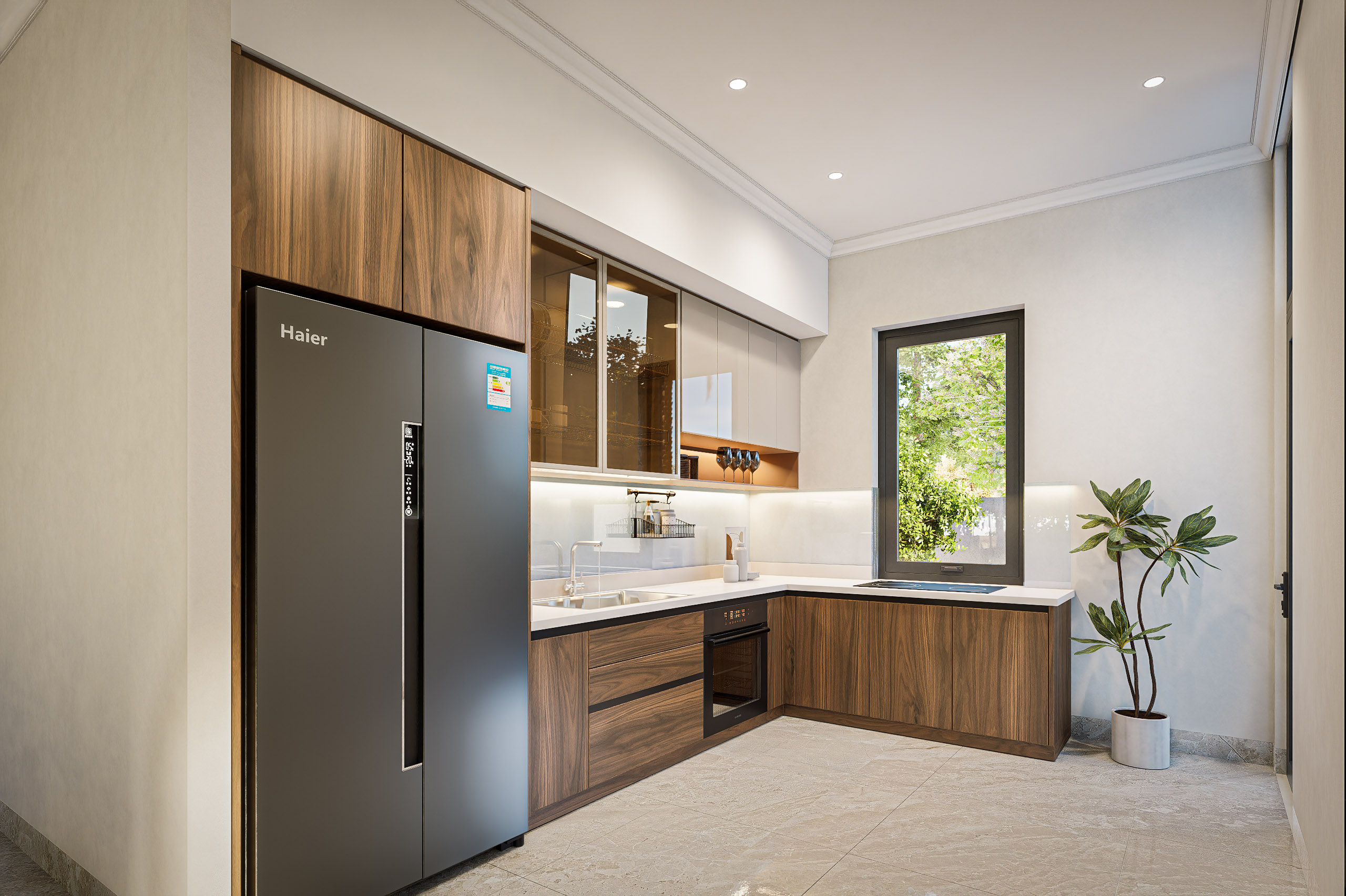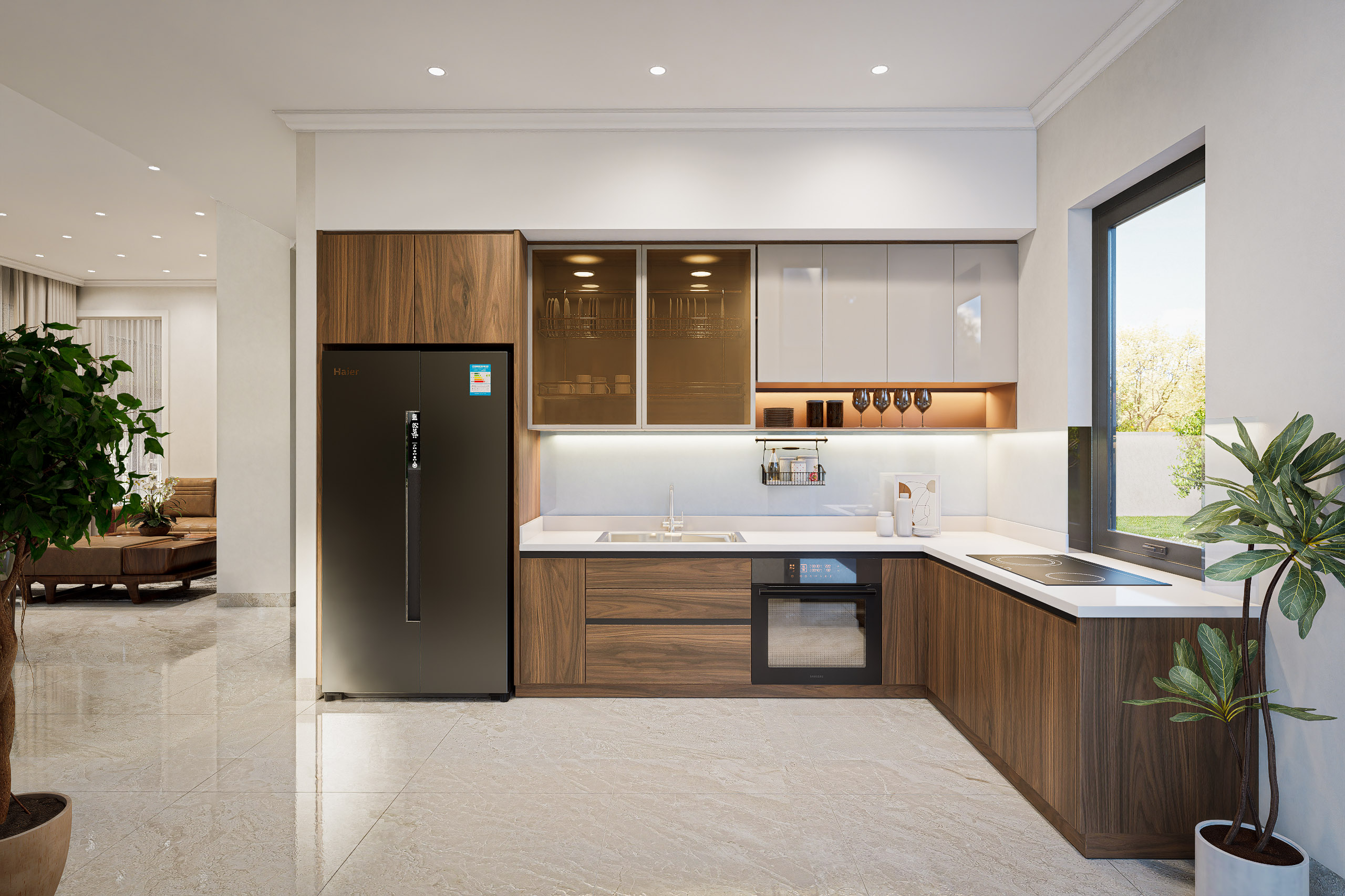 Khu vực bếp được thiết kế theo phong cách hiện đại, gọn gàng với hệ tủ thông minh và các thiết bị cao cấp. Cửa sổ lớn giúp không gian luôn thông thoáng và ngập tràn ánh sáng, tạo cảm hứng cho người nội trợ.