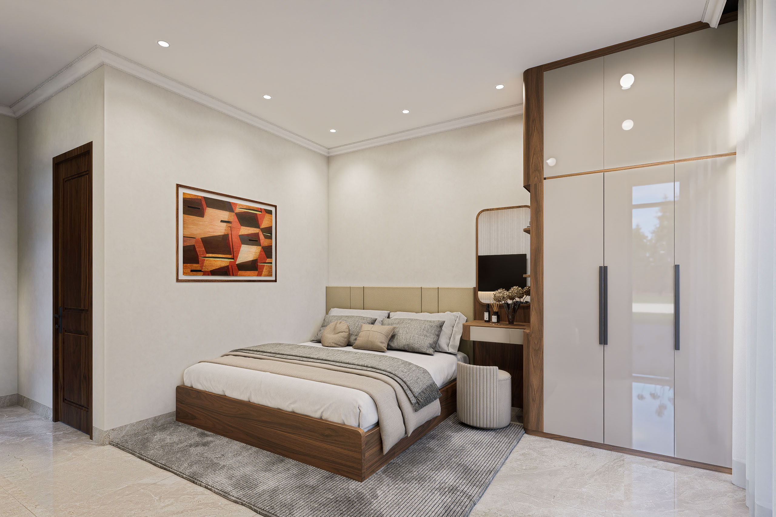 Phòng ngủ master là sự kết hợp hoàn hảo giữa không gian nghỉ ngơi và làm việc. Nội thất được thiết kế đồng bộ, tận dụng tối đa diện tích với bàn làm việc, tủ quần áo và kệ tivi liền khối, mang lại sự tiện nghi và thẩm mỹ cao.